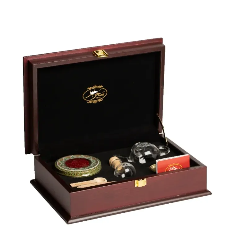 گنجینه سرخ فام یکی از جذابترین محصولات برند خوشآوازه سحرخیز است که میتوان بهعنوان هدیهای گرانبها و ارزشمند آن را به عزیزان و دوستان هدیه کرد. جنس بستهبندی این زعفران از چوب باکیفیت است. ۴ گرم زعفران باکیفیت سرگل درون یک جعبه خاتمکاری در این جعبه قرار گرفته و در کنار آن، یک هاون مسی، یک عدد قوری کوچک کریستالی برای دمکردن زعفران، قاشق و پنس چوبی و همچنین شیشه مخصوص زعفران وجود دارد.