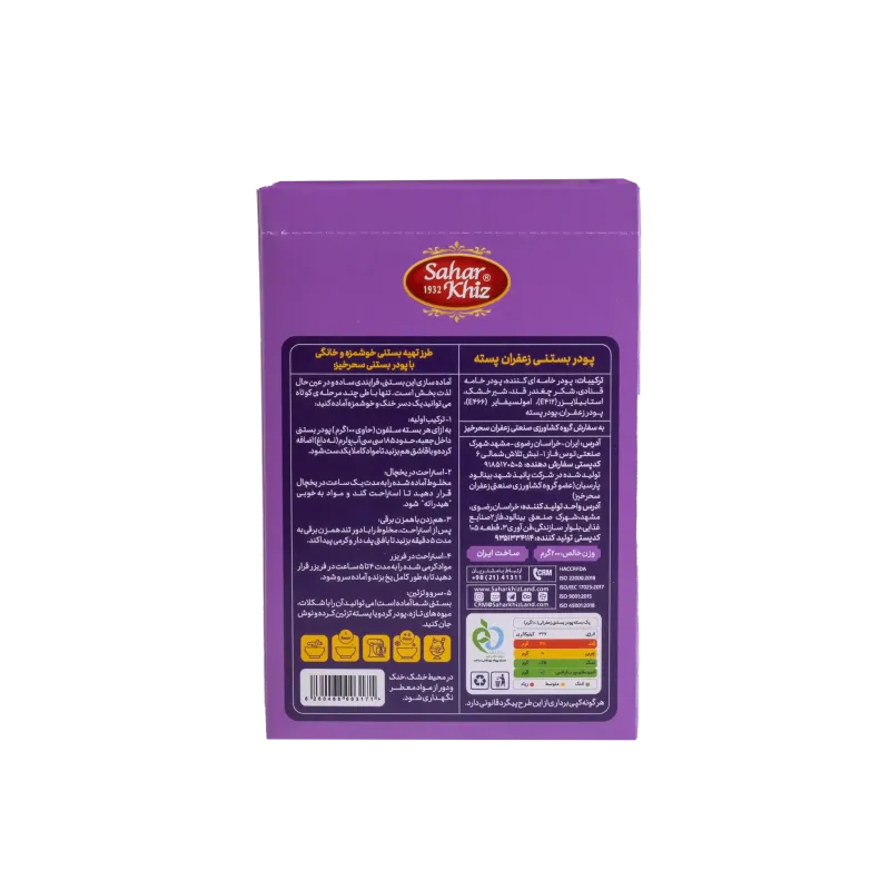پودر بستنی زعفرانی با پسته سحرخیز، یک دسر آماده خانگی و نیمهصنعتی است که با ترکیب متعادل شیرخشک، پودر خامه لبنی و شکر با میزان کنترلشده تهیه شده است. این محصول با استفاده از مواد اولیه طبیعی و درجه یک، بدون هیچ گونه نگهدارنده یا افزودنی شیمیایی، تجربهای خوشمزه و سالم از بستنی زعفرانی و پسته ارائه میدهد.